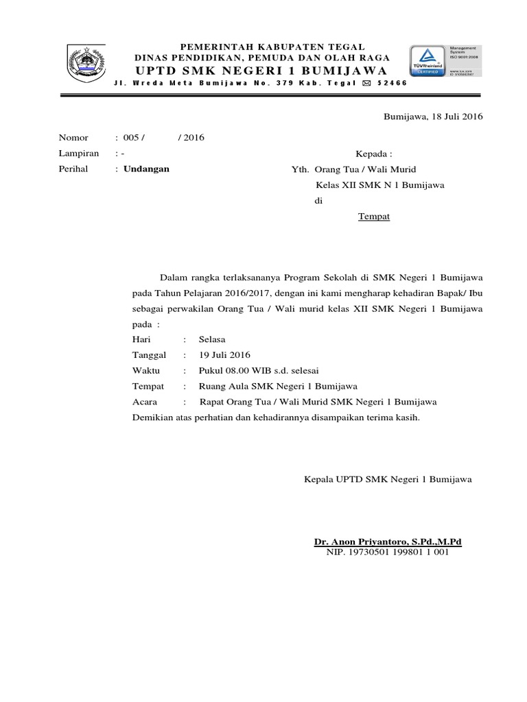 Contoh Surat Undangan Resmi Sekolah Untuk Orang Tua : Contoh Pembuatan Undangan Rapat Sekolah Dan Orangtua Wali Kosngosan / Adapun tujuan penggunaan surat resmi sekolah tergantung dari isinya, seperti undangan rapat untuk orang tua siswa.. Atas perhatian dan kerjasamanya kami selaku pihak sekolah mengucapkan terima kasih. Surat undangan resmi pada berbagai kegiatan yang resmi sebagai manfaat dan referensi membuat surat undangan resmi yang profesional. Surat organisasi siswa intra sekolah (osis). Surat diatas merupakan surat penawaran jasa dari pt elektro jaya untuk menginstalasi listrik di. Simak contoh surat resmi bahasa lokal berikut agar lebih mudah dipahami.